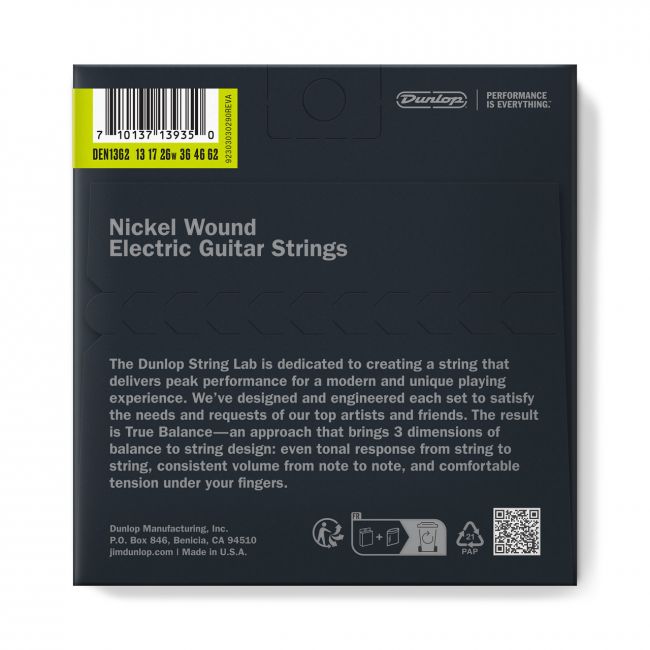 Dunlopin True Balance -resepti asettaa kielten välisen balanssin kohdalleen. Setti tuntuu otelaudan jokaisesta kohdasta hyvältä soittaa. Kielen ytimen ja punoksen erityinen suhde tekee kielestä kevyemmän soittaa ja nopeamman tuntuisen. Ylätaajuudet säilyttävät selkeytensä aggressiivisen keskialueen ja tiukan alapään rinnalla.