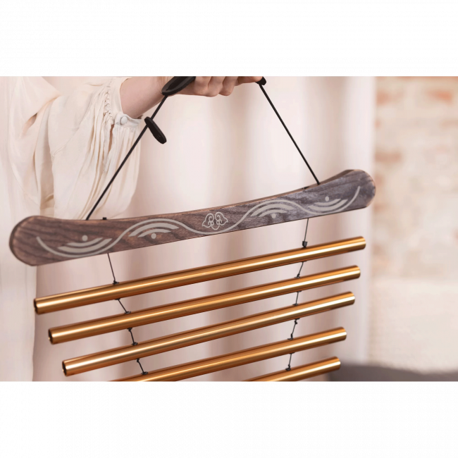 Sonic Energy Meditation Flow Chimes on kaunis, kädessäpidettävä chimes meditaatioon, rentoutumiseen, terapiaan tai ihan vaan koristeeksi. Muhkea ja pitkä sointi, joka suorastaan täyttää huoneen.Meditation Flow Chimesissa on pidike molemmissa päissä, joten sitä voidaan soittaa kädessä kummin päin tahansa. Kun soivaa chimesia heilutellaan, sen soinnista tulee erityisen rauhoittava ja orgaaninen.