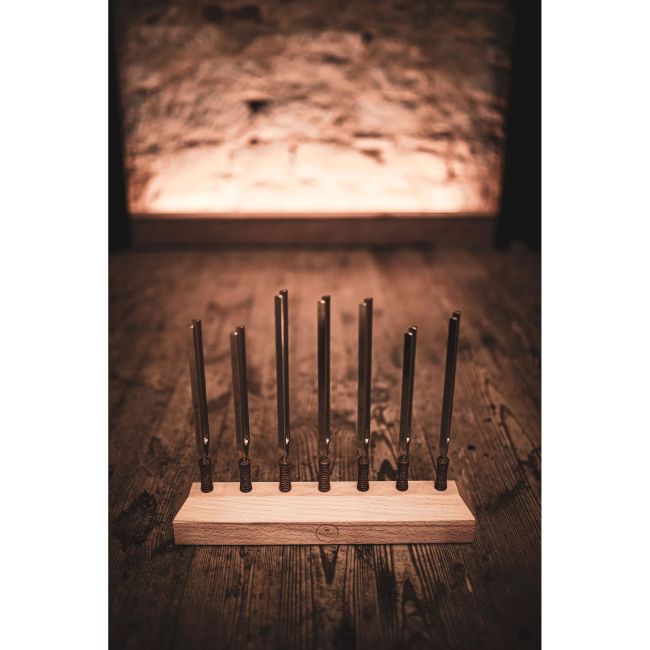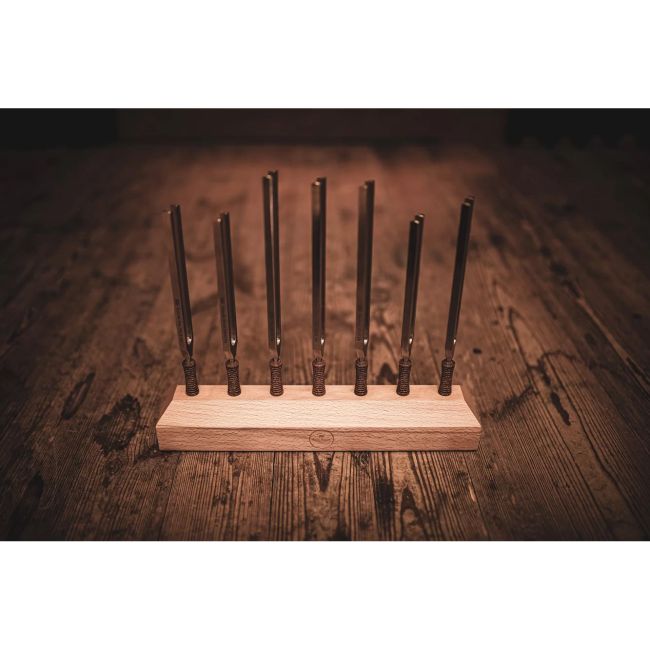 Meinl Sonic Energy Therapy Charka setissä on kaikille seitsemälle Chakralle oma viritetty terapiaäänirauta valmiina. Mukana tulee kätevä puinen teline johon kaikki raudat saa pystyyn.Sonic Energy Therapy -terapiaääniraudat ovat perusmalleja pidempiä ja soivat siksi myös pidempään. Tarkoitus on vähentää terapiaistunnossa vaadittavien iskujen määrää.